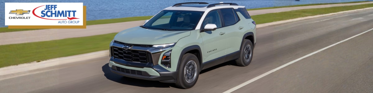 At Jeff Schmitt Chevy South, we know that buying a new SUV is a big decision. That's why we back every new Chevy Equinox with the Jeff Schmitt Advantage, which includes two free oil changes and tire rotations for the first year, a 72-hour exchange policy, and our Best Price Guarantee. If you find the same vehicle at a lower price within five days, we'll refund 100% of the difference. We want you to feel good about your choice long after you drive off the lot.